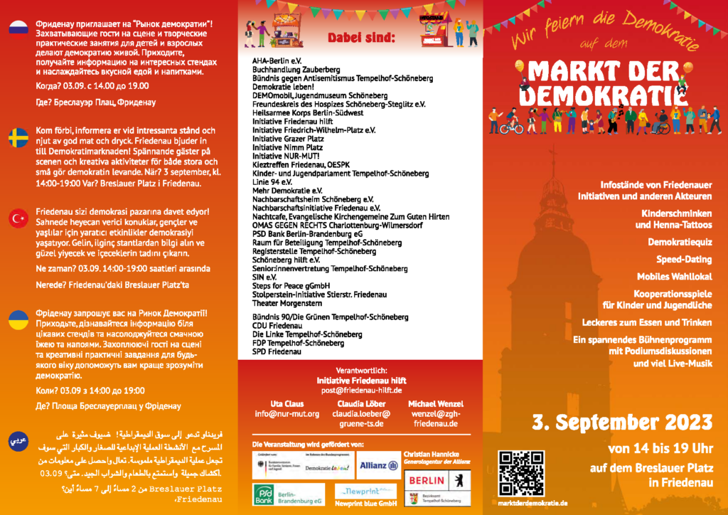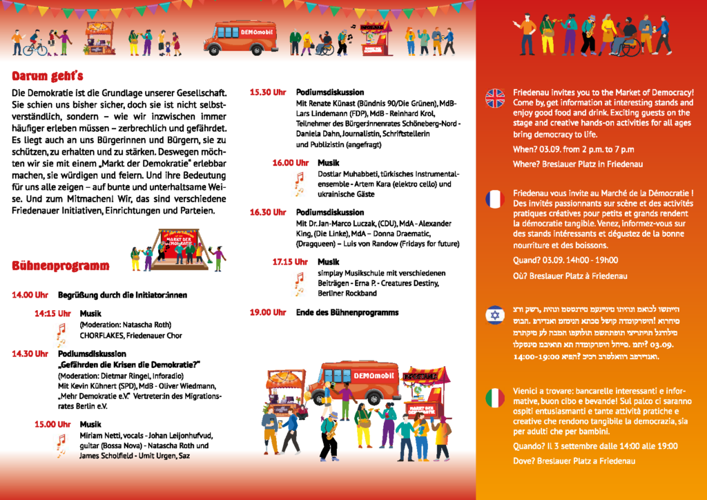 Der „Markt der Demokratie“ findet am 3. September 2023 von 14 bis 18 Uhr auf dem Breslauer Platz/Friedenau statt.